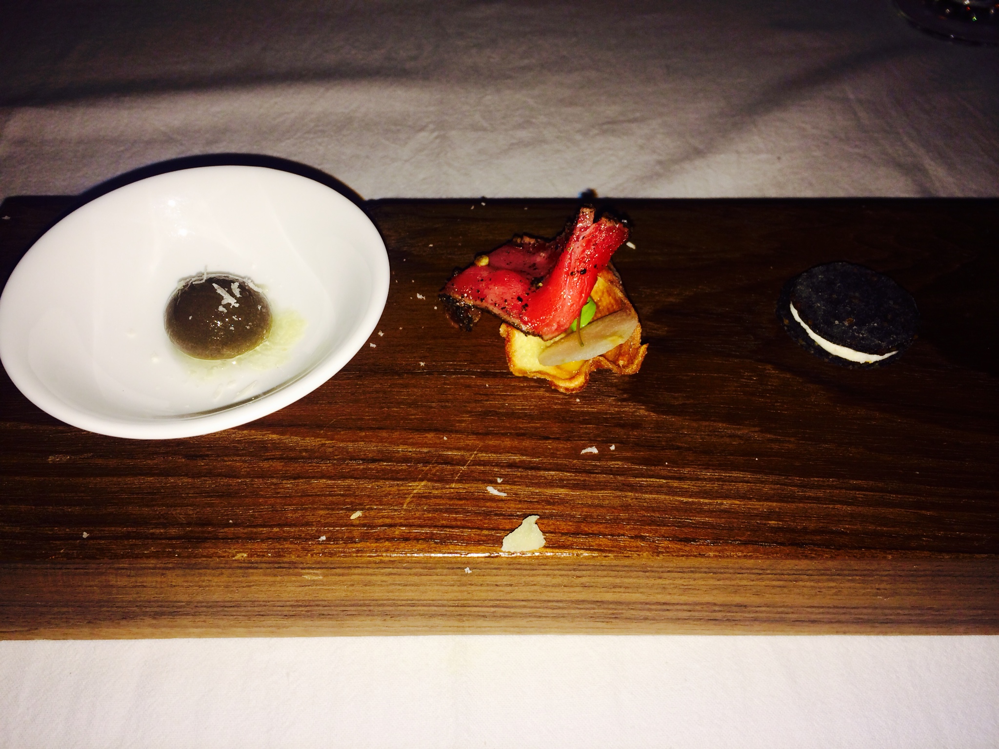 The 1st course was about deception. It had a faux Oreo made of parmesan cheese and charcoal powder filled with a delicious orange flavoured goat cheese mousse. The Olive sitting next to it was not just your ordinary olive but fashioned out of olive puree and then spherified, using an intricate culinary technique first introduced by el Bulli in 2003.