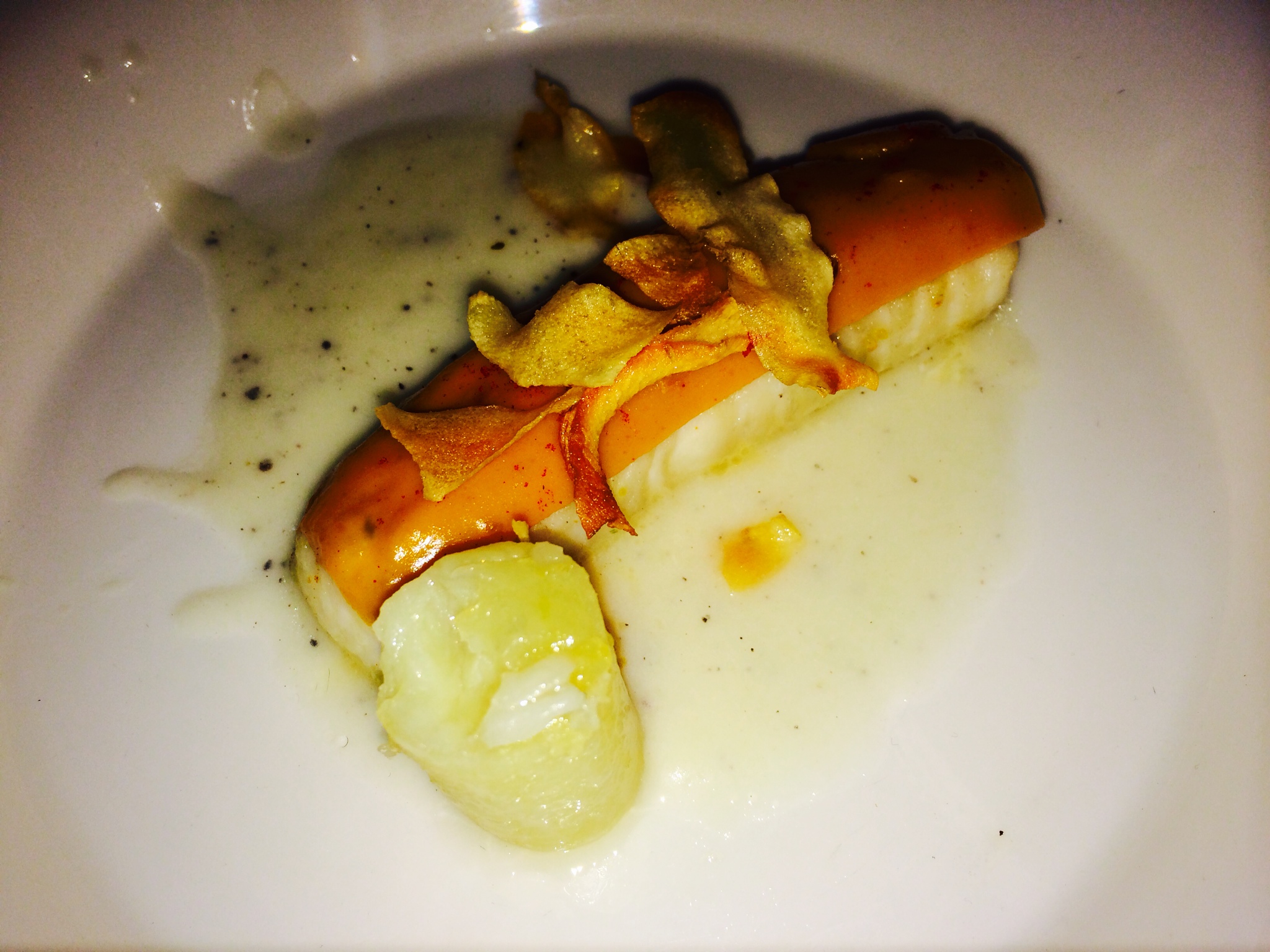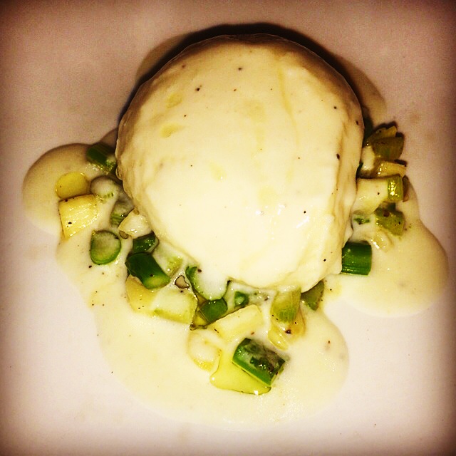 The next course “Just like an Egg” was made from potato puree and white asparagus milk. As I put my spoon into what looked like a perfectly poached egg, there oozed out a luscious golden yolk made from roasted red bell peppers. The contrast to the soft texture was provided by finely chopped pieces of white and green asparagus.