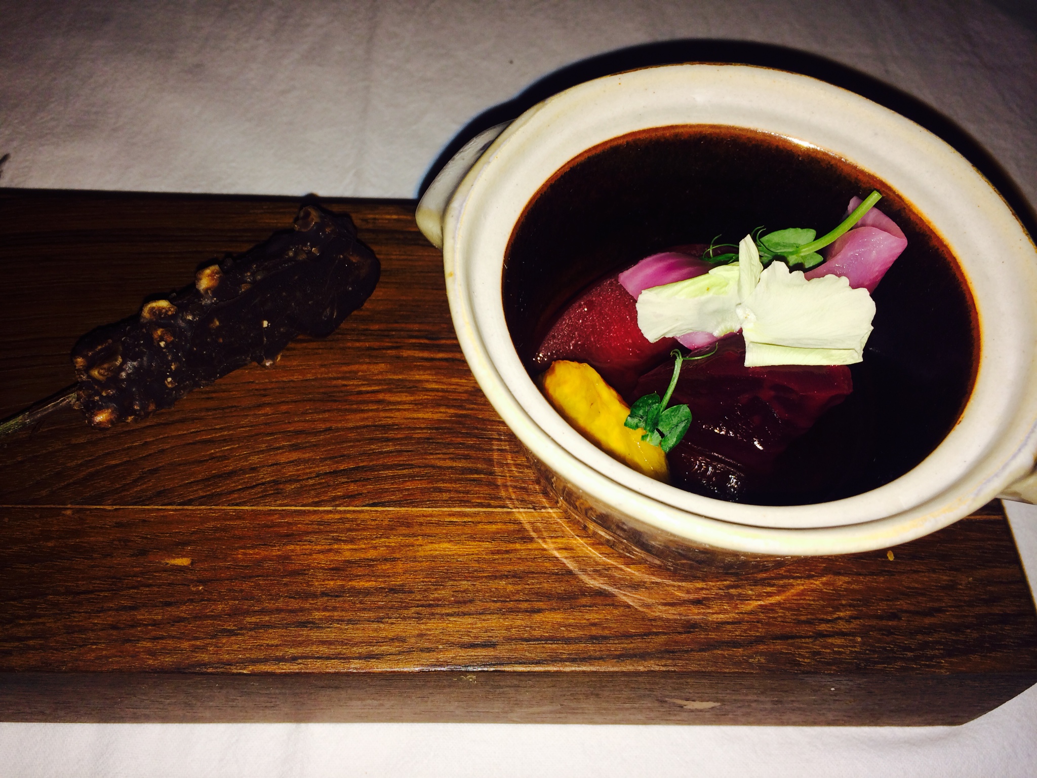 Parsnips, black radish, turnip & baby carrots were used for the next course aptly called Roots from “The Green Bean Farm”. Having the right amount of crunch to them, they made a good combination with the thinly sliced scallops, the wild chive emulsion adding to the texture and taste. The stand-out element in this dish was a sprinkling of “fermented black garlic powder” on the salad. Just this one ingredient took a month and a half to perfect.