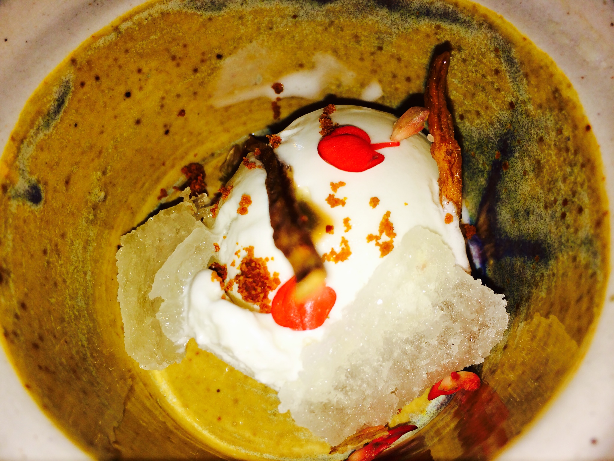 The 8th course of 4S Buttermilk, Ash Gourd Radish & Apple Blossom (from Krishi Cress Farm, Delhi) was unlike any that I had tasted before. The buttermilk was churned into an ice-cream and the slightly salty flavour offset with candied ash gourd made by marinating the ash gourd in choona (calcium hydroxide) thereby firming it up, using the same technique used for making Petha (remember the famous Panchi Peetha of Agra).